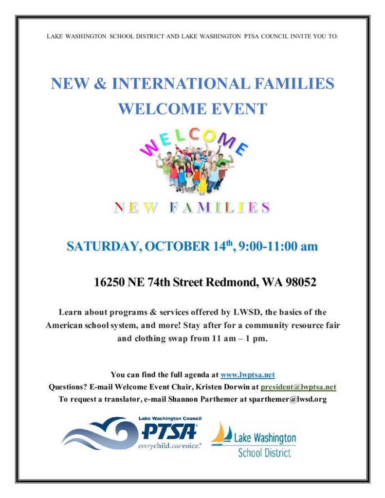 Lake Washington PTSA Council, in coordination with Lake Washington School District, is looking forward to hosting our 7th annual Welcome Event for New and International Families on Saturday, Oct. 14, 2023, from 9 to 11 am at the LWSD Resource Center, located at Redmond Town Center.