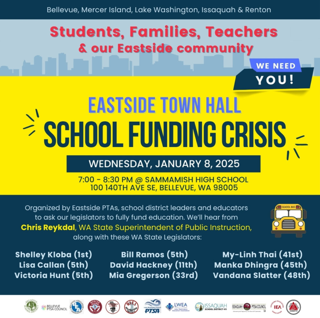 Join members of the LWSD community and our Eastside district neighbors for a town hall on the school funding crisis. Together we can strengthen and amplify our efforts to advocate for FULLY FUNDING EDUCATION for all children!