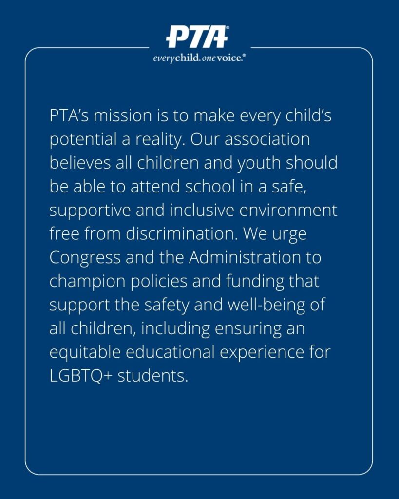 This entry was posted in Advocacy, Diversity, Equity, Inclusion, National PTA, News and tagged advocacy, child safety, diversity, equity, inclusion, lgbtqia, National PTA, public education by LWPTSA Webmaster. Bookmark the permalink.