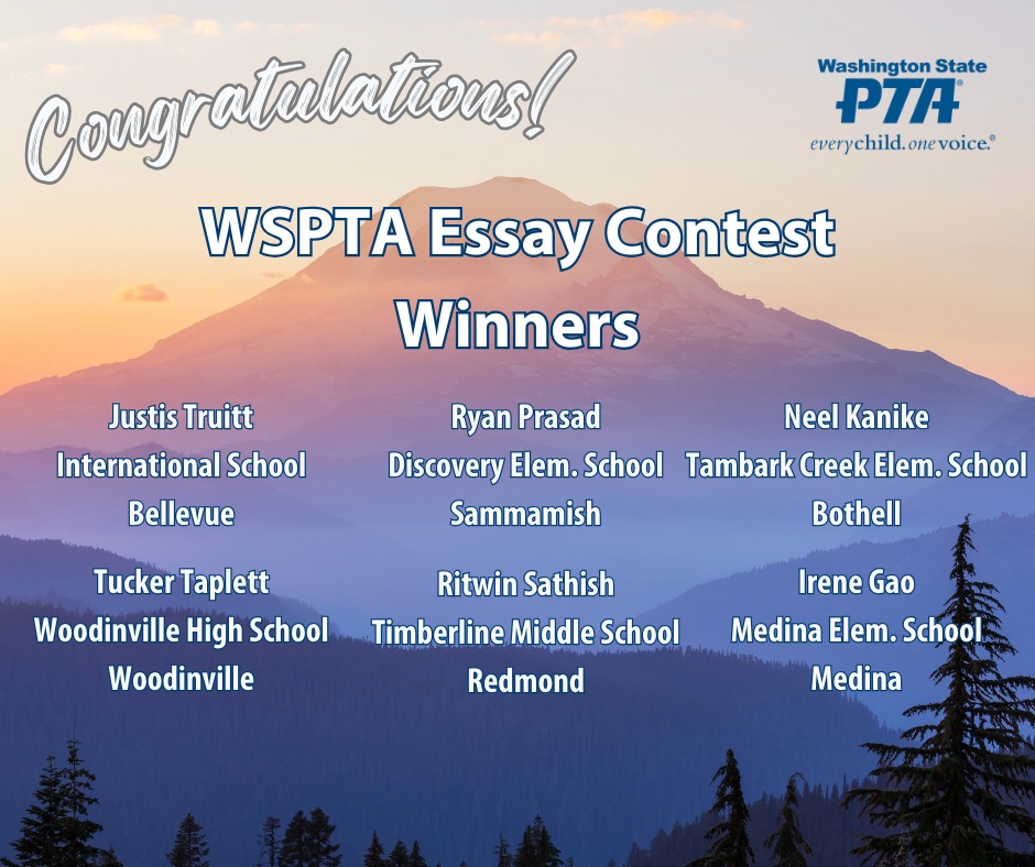 Congratulations, 2024-25 WSPTA Essay Contest Winners!LWPTSA Council extends congratulations to the winners of Washington State PTA’s 2024-2025 Essay Contest! We are especially proud to give a special shout out to one of our local PTSA’s students, Ritwin Sathish of Timberline Middle School PTSA, winner in the grades 6–8 division!