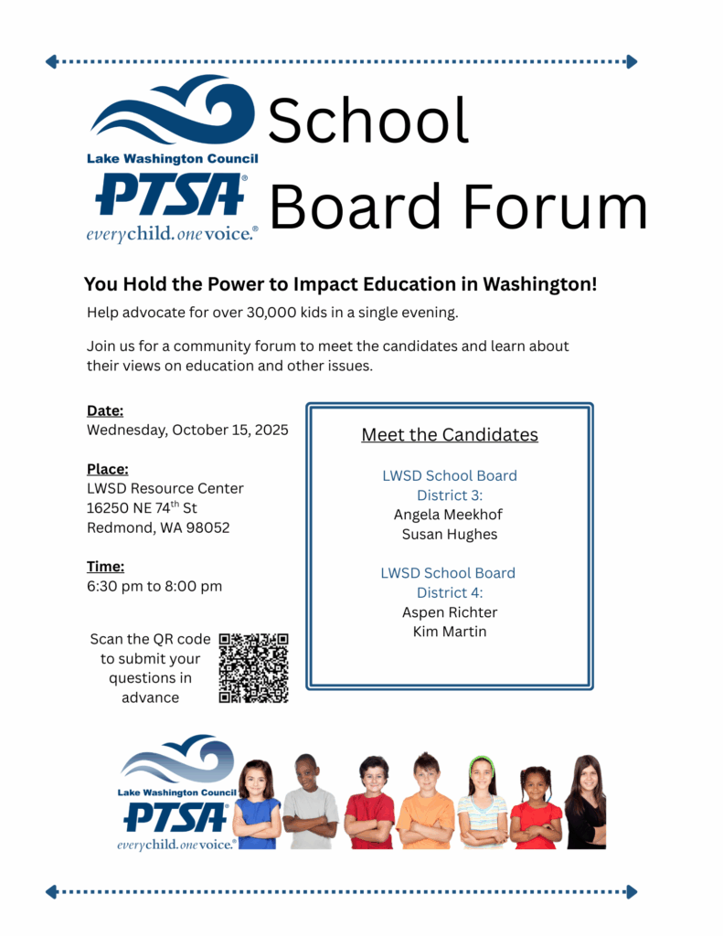 Join us for an evening of connection, conversation, and community impact! The Lake Washington PTSA Council is hosting a lively, interactive forum featuring School Board Candidates from Districts 3 and 4. This is your chance to hear directly from those seeking to represent LWSD families—and to ask the questions that matter most to you.