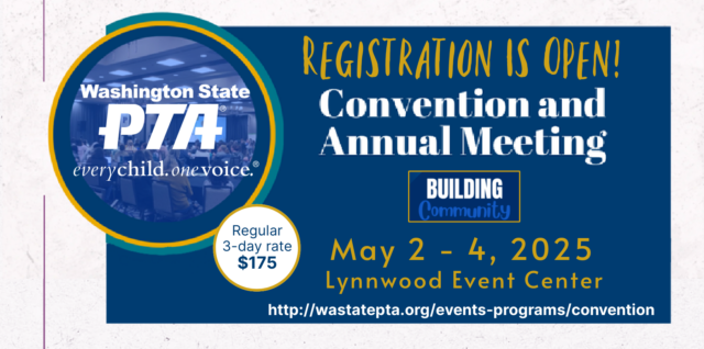 May 2-4, 2025, at the Lynnwood Event Center Washington State PTA is excited to announce the 112th WSPTA Convention and Annual Business Meeting, taking place from May 2-4, 2025, at the Lynnwood Event Center in Lynnwood, Wash. This three-day event Continue reading Registration for WSPTA 2025 Convention & Annual Meeting Is Open