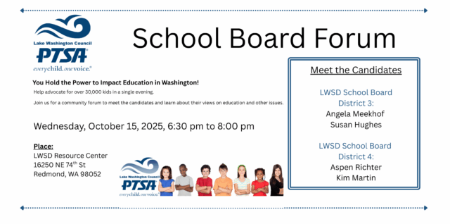 Join us for an evening of connection, conversation, and community impact! The Lake Washington PTSA Council is hosting a lively, interactive forum featuring School Board Candidates from Districts 3 and 4. This is your chance to hear directly from those Continue reading Your Voice, Their Vision: LWSD School Board Candidate Forum